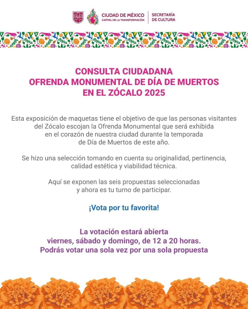 Del viernes 8 al domingo 10 de agosto, de 12 a 20 horas, el público podrá elegir la Ofrenda Monumental para el Día de Muertos 2025 que se instalará en la Plaza de la Constitución. La cita es en el Zócalo capitalino, donde se exhibirán las maquetas de los proyectos preseleccionados para la votación abierta.