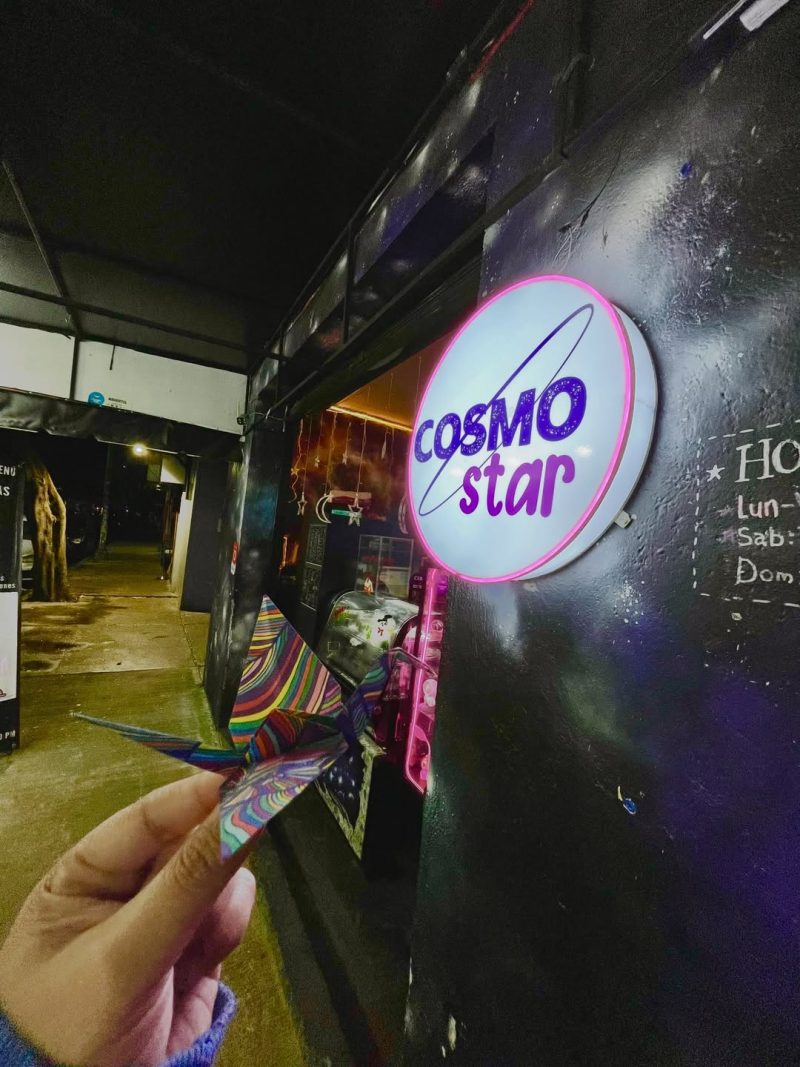 Otro de los detalles que hacen especial a Cosmostar es su propuesta de bebidas decoradas con lo que el lugar describe como “polvo de estrellas”. En realidad se trata de ingredientes brillantes o decorativos que aportan un efecto visual único, haciendo que algunas bebidas parezcan literalmente luminosas.